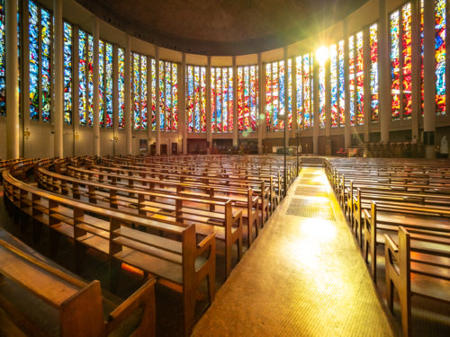 Le maître verrier, Max Ingrand, a réalisé un immense ensemble de vitraux, savant puzzle aux références bibliques qui  joue avec la lumière extérieure. Elle est à ce jour la plus grande verrière d’Europe.